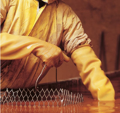 ถุงมือยางธรรมชาติ ภายในบุด้วยใยฝ้าย มีลายนูนด้านนอกป้องกันลื่น ความยาว 33 cm. หนา 0.40 mm.